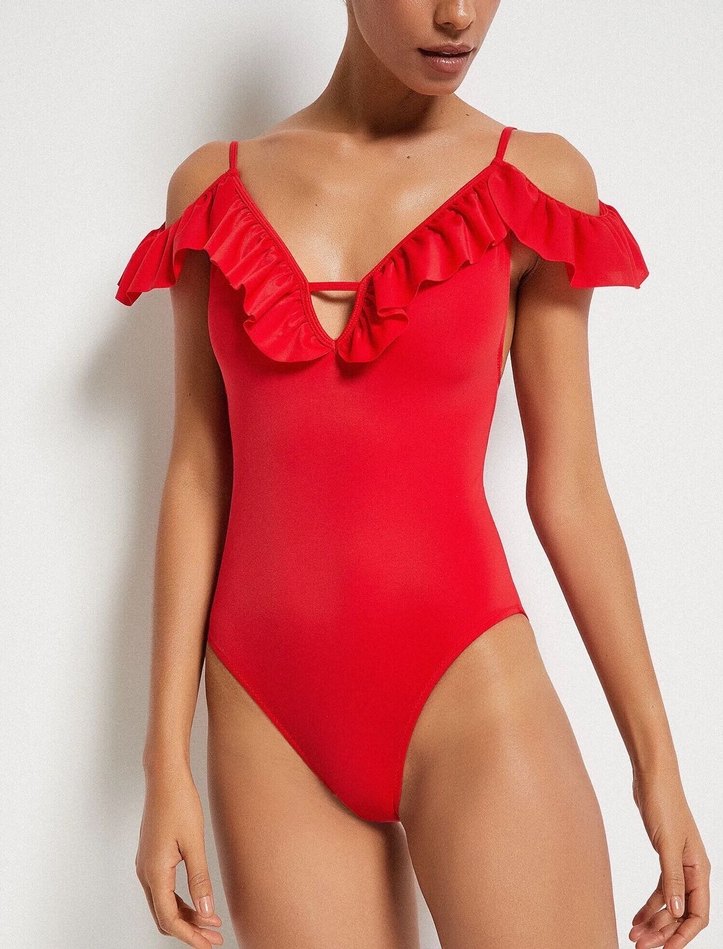 Kırmızı Fırfırlı İnce Askılı Kadın Mayo