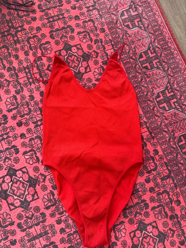 İpli askılı, fırfırlı detaylı kırmızı kadın mayo. Renkli batik desenli, bohem tarzı plaj kullanımı için uygun. ️