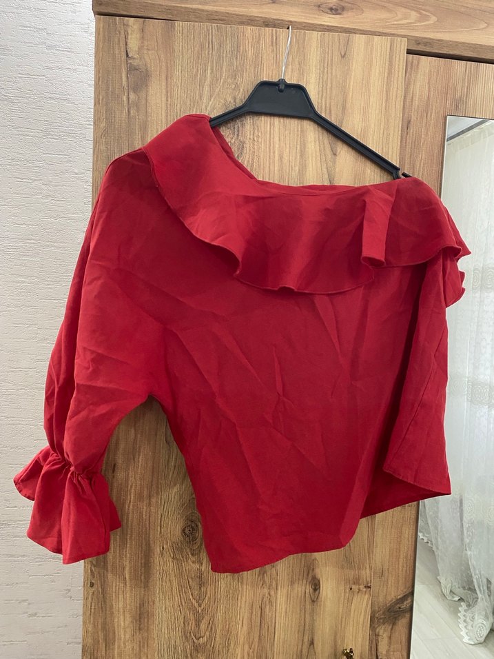 Kırmızı, keten kumaştan, fırfırlı detaylı, kayık yaka ve uzun kollu bol kesim midi boy bluz. Parlak dokusuyla günlük sokak stiline uygundur.