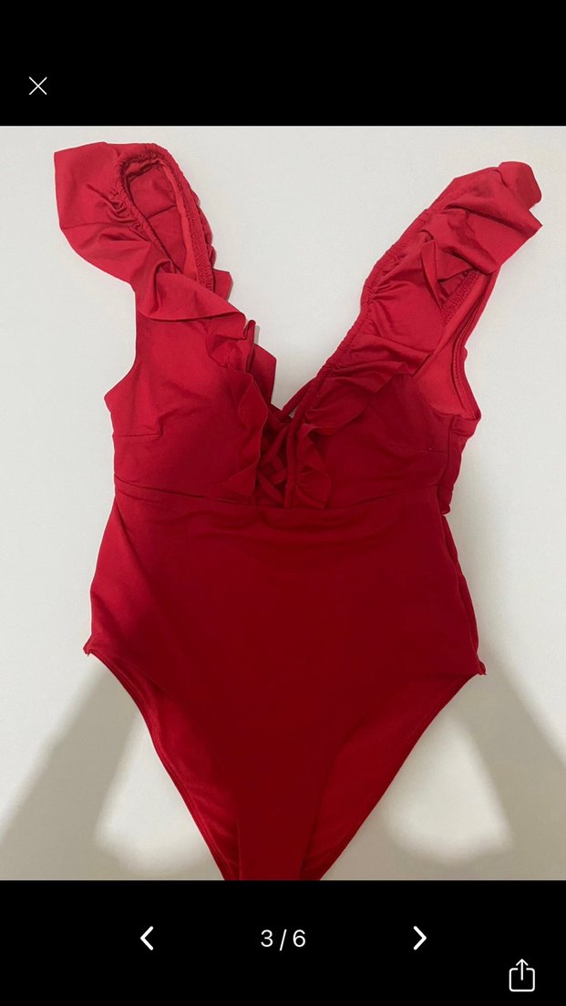 Kırmızı renk, fırfırlı detaylı ve ince askılı, vücuda oturan kadın mayo. Bohem tarzıyla plajda dikkat çeker.