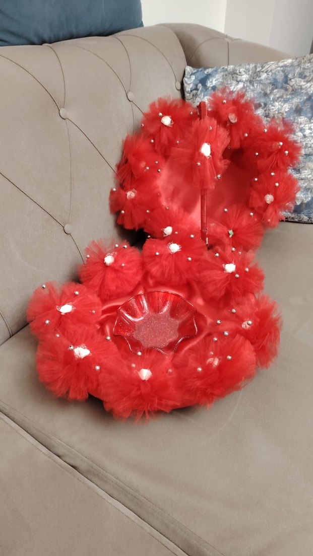 Kırmızı sentetik kumaştan, fırfırlı ve inci detaylı renkli avant-garde tarzda kadın saç aksesuarı. İkili gönderim sağlanacak kına tepsisi ve sepet