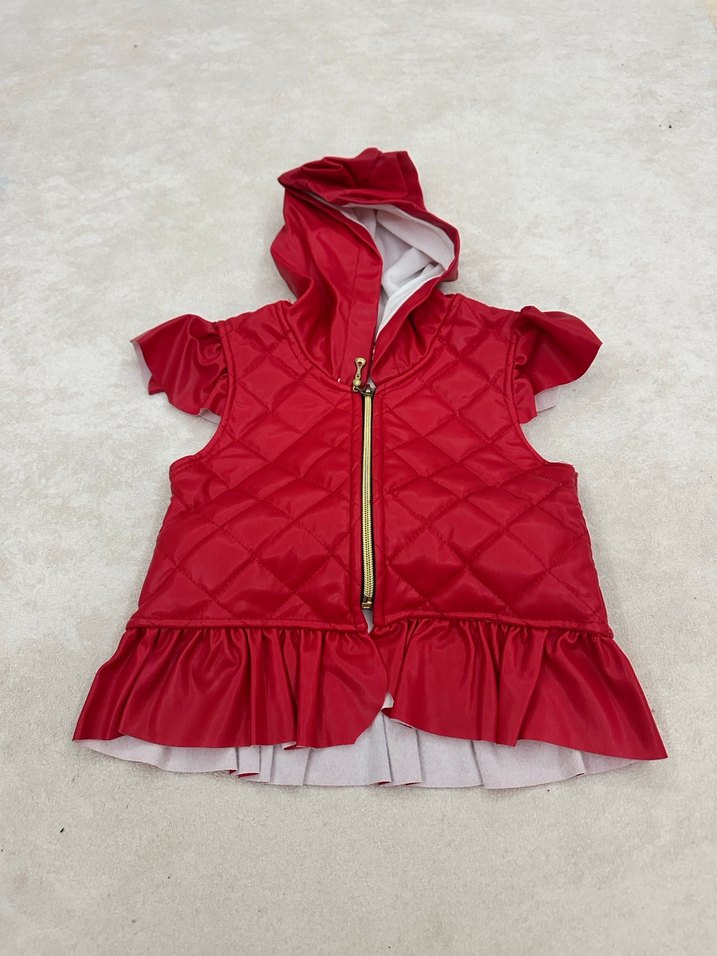 Kırmızı renkte, kapüşonlu, fırfırlı kollu ve etek ucu detaylı sokak stili yelek Boy 35 cm (8.ç) #bebek #giyim #kıyafet
