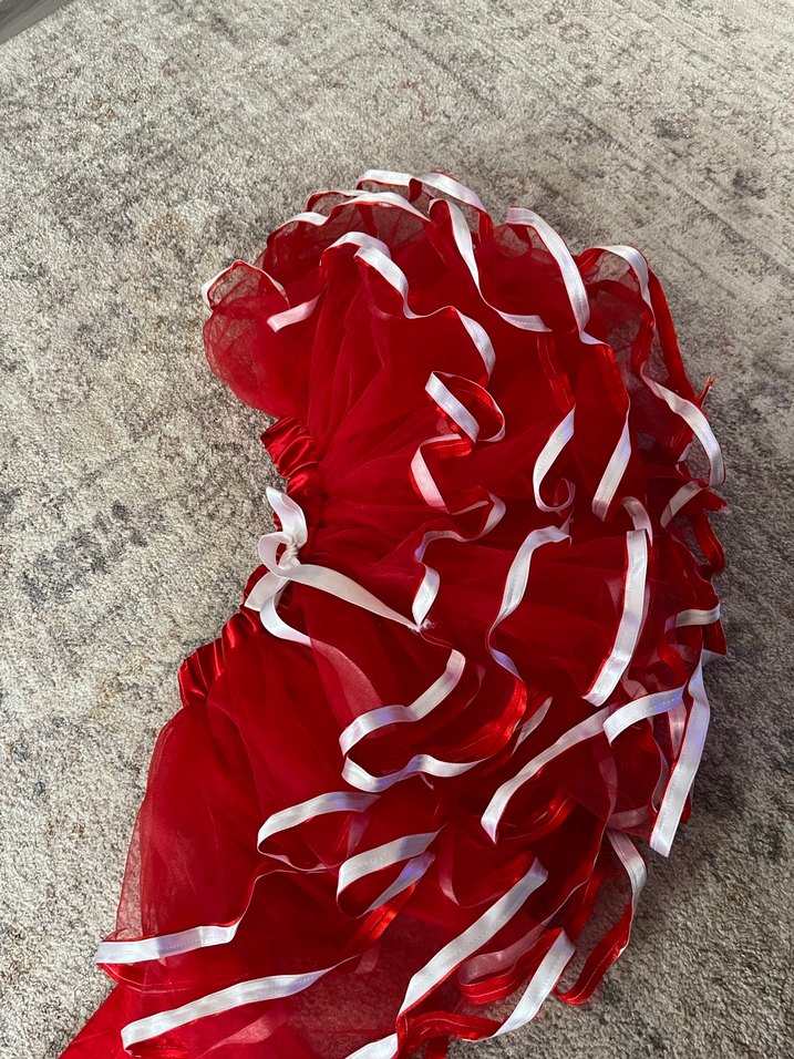 beyaz şeritli kırmızı fırfır detaylı kırmızı etek