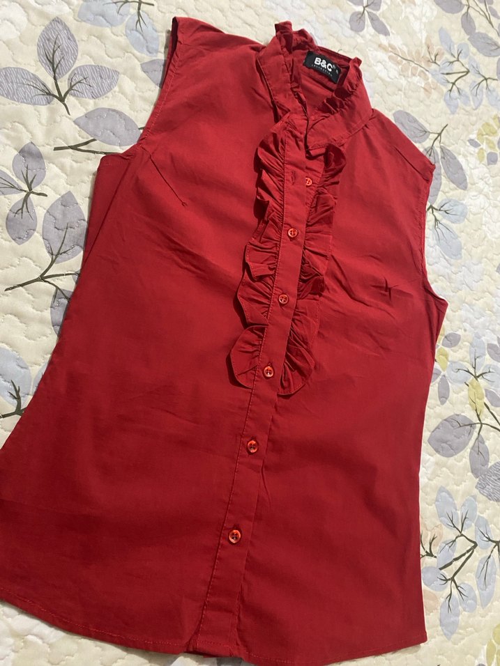 Parlak kırmızı renkte, yakalı ve düğme önünde fırfır detaylı kolsuz kadın gömleği. Sentetik kumaştan, vücuda oturan ve normal boyda. Günlük rahat sokak stili için uygun.
