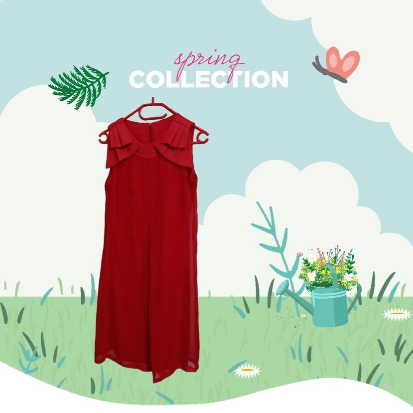 Kırmızı renkte, fırfırlı detaylı, yüksek yakalı, kolsuz ve bol kesim midi elbisedir. Minimalist ve renkli tasarımıyla günlük kullanıma uygundur.
