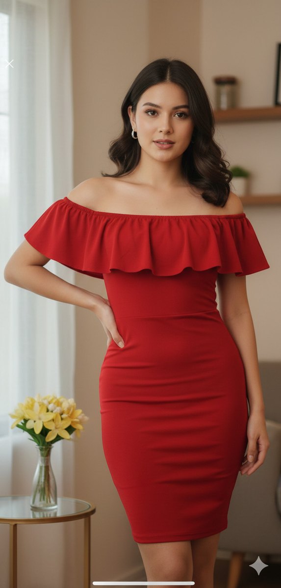 Kırmızı, parlak kumaştan, fırfırlı ve kayık yaka detaylı, kolsuz, vücuda oturan midi elbisedir. Romantik akşamlar için uygundur.