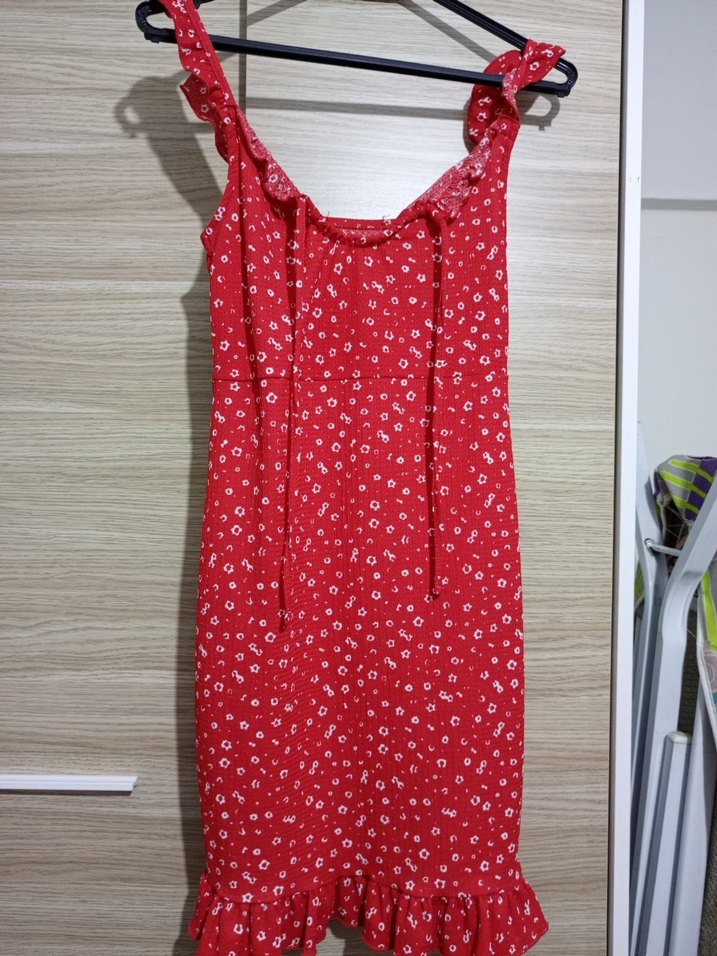 Kırmızı renkli, askısız yaka ve fırfır detaylı, vücuda oturan midi boy elbise. Canlı tie-dye desenlidir.