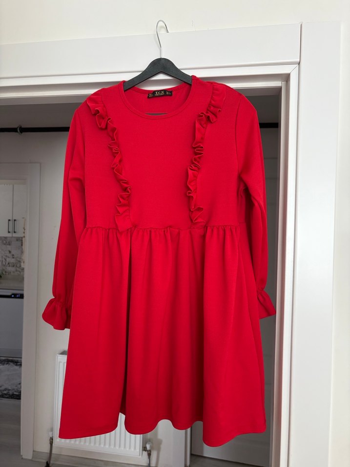 Kırmızı renkte, uzun kollu ve bol kesim midi tunik. Ön kısmında fırfır detayları bulunur, yumuşak ve sıcak kumaştan yapılmıştır.