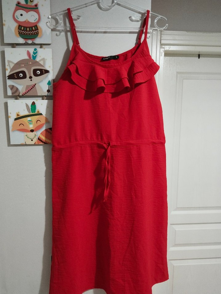 Kırmızı keten midi elbise, askılı ve fırfırlı detaylara sahip, bol kesimli ve sade tasarımlı bohem tarzda.