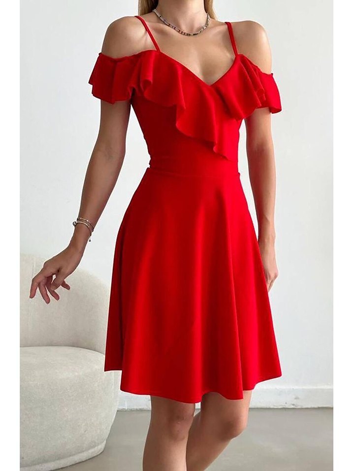 Vücudu güzel toparlayan, hafif esnek kumaş. Temiz durumda, defo yok. Özel günler, doğum günü geceleri veya davetler için ideal. Hem şık hem sade durduğu için kolayca kombinlenebilir. Modeli vücutta çok zarif duruyor.” Kırmızı mini elbise, V yaka ve fırfır detaylıdır. İnce askılı ve modern klasik tarzda, romantik buluşmalar için uygundur.