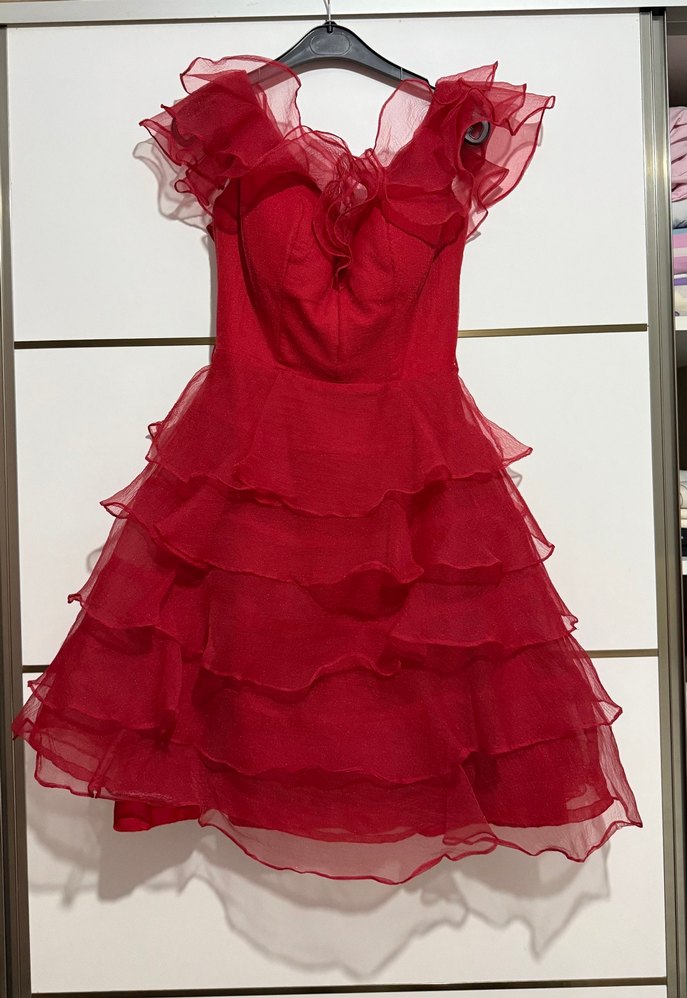 Kırmızı Fırfırlı Mini Abiye Elbise