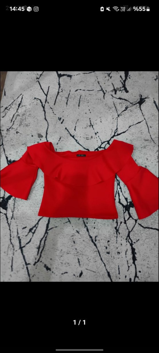 Kırmızı, tek renk, fırfırlı detaylı, uzun kollu, kısa kesim, dar kesim bluz. Salaş sokak tarzına uygun.
