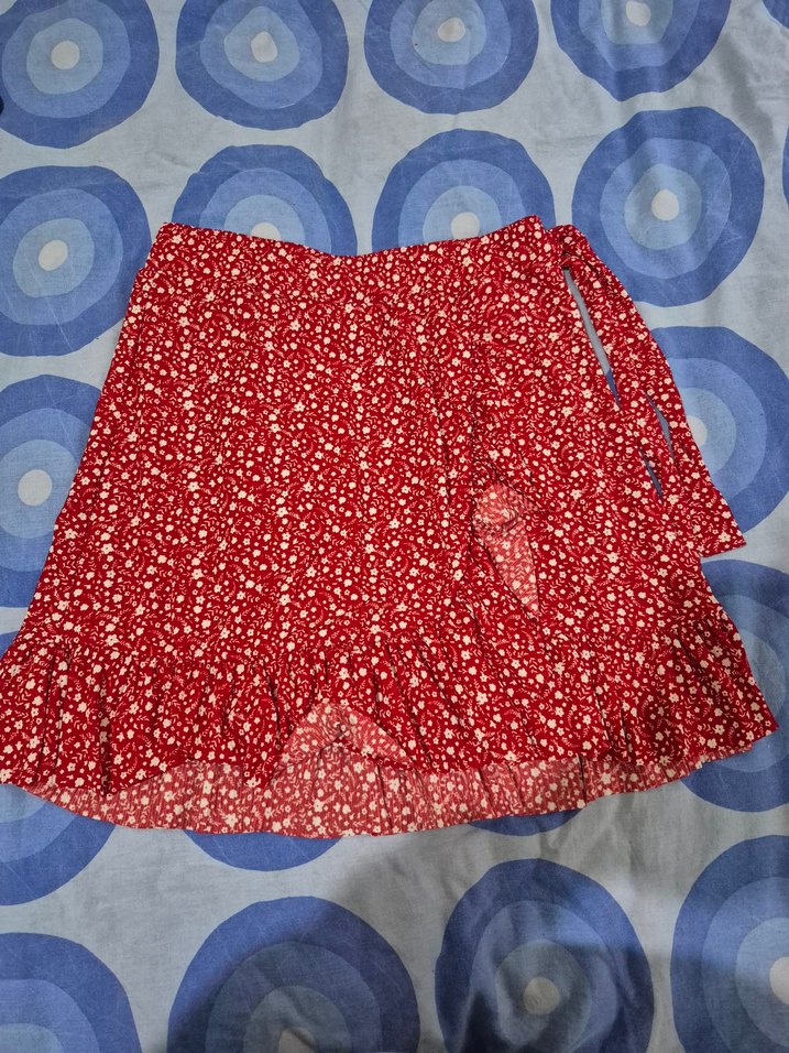 Kırmızı renkli, fırfırlı detaylara sahip, bol kesim mini bohem etek. Canlı renkleriyle dış mekan kullanımı için uygundur.