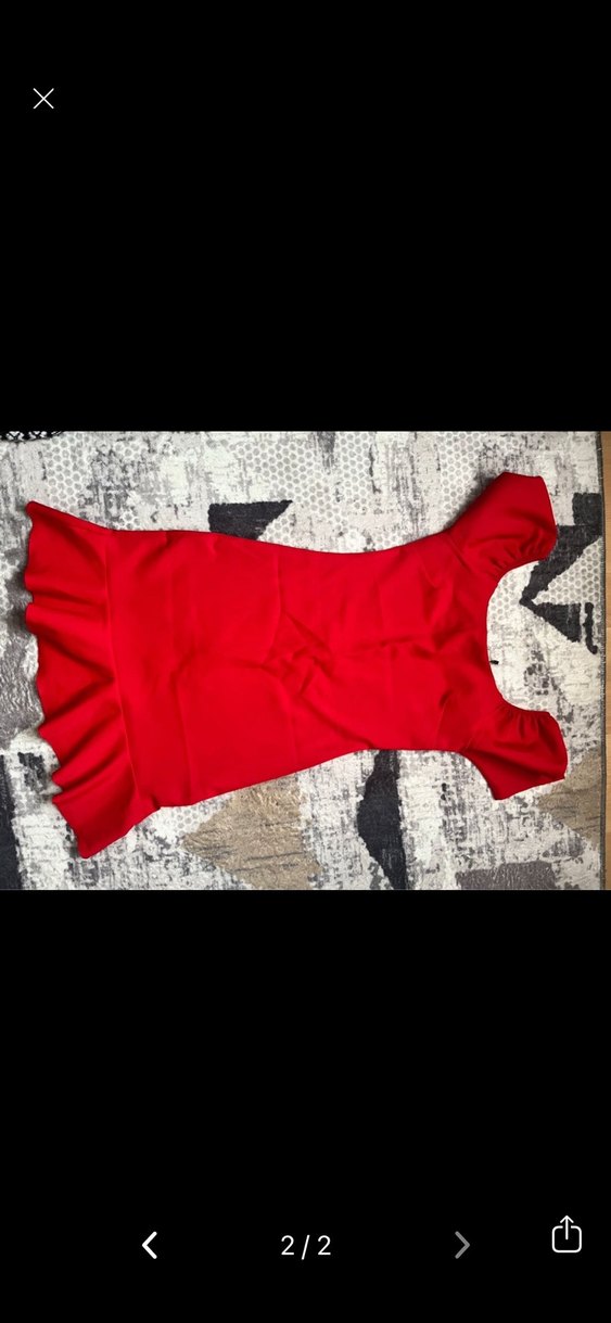 Kırmızı renkli, tek parça mini elbise, fırfırlı detaylı ve kayık yaka. Sentetik kumaştan, kolsuz ve dar kesimdir.