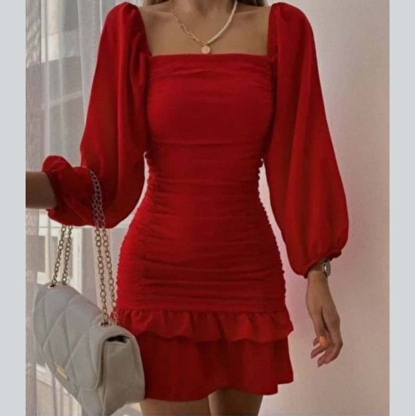 Kırmızı, vücuda oturan mini elbise yüksek yakalı, uzun balon kollu ve etek ucunda fırfır detaylara sahiptir. Pürüzsüz sentetik kumaştan üretilmiştir.