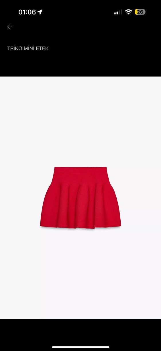 Düz kırmızı renkli, fırfırlı ve kısa kesim, düz kesim mini etek. Yumuşak sentetik kumaştan yapılmıştır, günlük kullanım için uygundur.