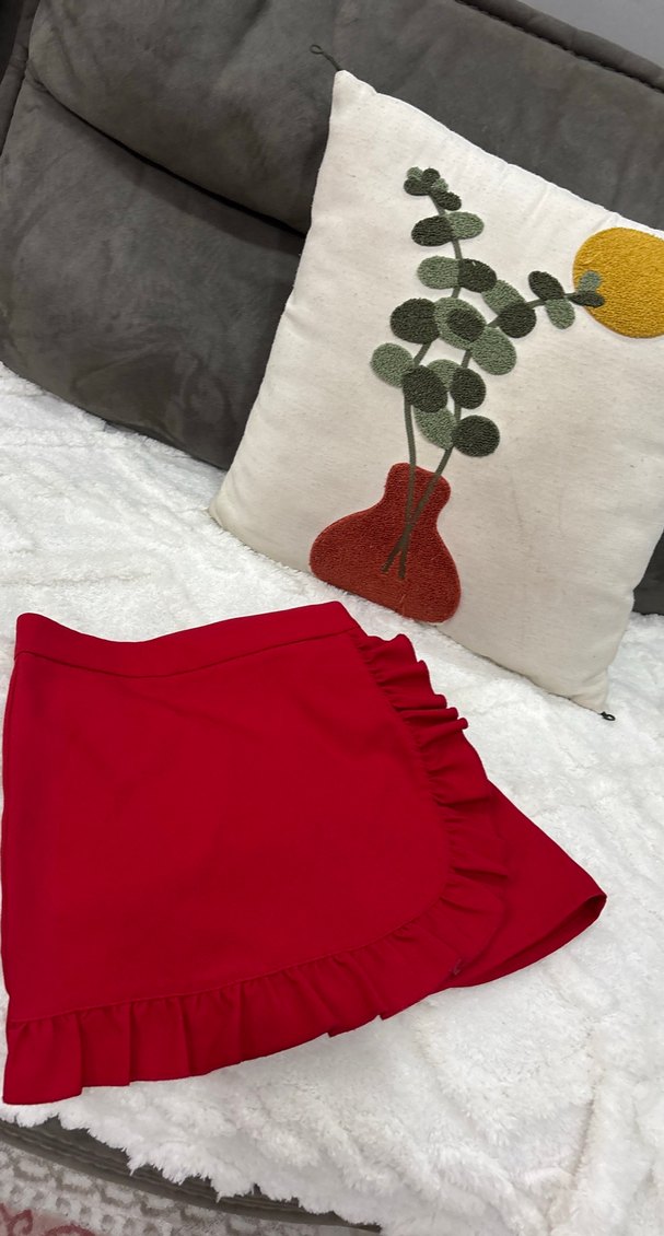 Yumuşak ve rahat kumaştan, fırfırlı ve nakış detaylı kırmızı, vücuda oturan mini etek, bohem tarz için uygundur.
