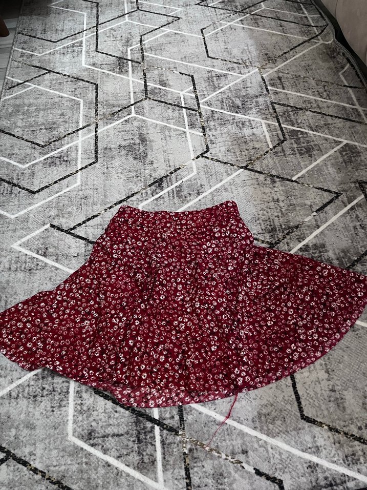 Kırmızı renkli, fırfırlı ve bol kesim mini etek. Sentetik kumaştan, koyu tonlu batik desenli bohem stilde, dış mekan kullanımı için uygun.