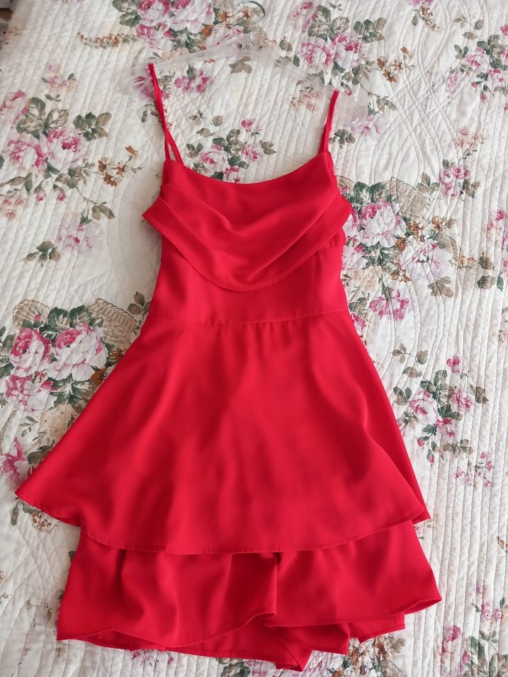 İnce askılı, straplez yaka ve fırfırlı detaylara sahip kırmızı mini elbise, yumuşak sentetik kumaştan üretilmiştir. Bohem Paris tarzıyla romantik akşamlar için ideal. ❤️