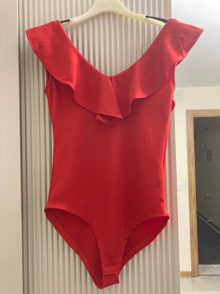 Cesur kesimi ve fırfırlı yakasıyla kırmızı, kolsuz, mini uzunlukta kadın mayosu. Minimalist ve desen içermeyen tasarımı parti için uygundur.