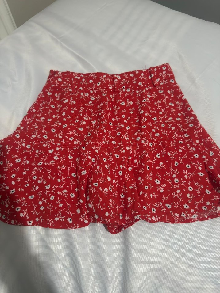 Yumuşak sentetik kumaştan, rahat kesim kırmızı mini etek. Fırfırlı detaylar ve koyu çiçek desenleriyle, dış mekan kullanımı için uygun.