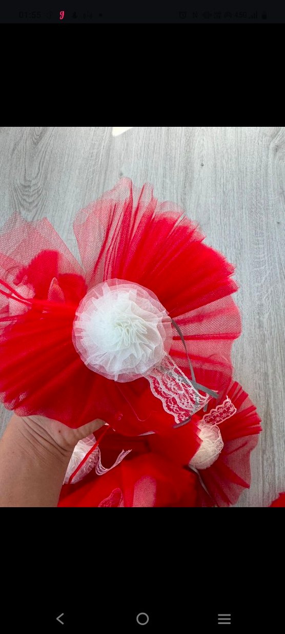 Canlı kırmızı renkte, nakışlı ve fırfırlı detaylara sahip bohem tarzda düğün konvoy süsü 10 adet olması lazım