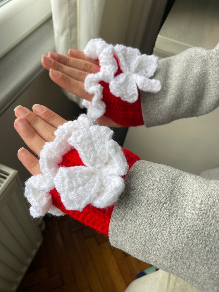 Kırmızı örgü eldivenler beyaz fırfırlı kenar ve fiyonk detayına sahip, rahatlık ve şık avant-garde tarzı sunar.