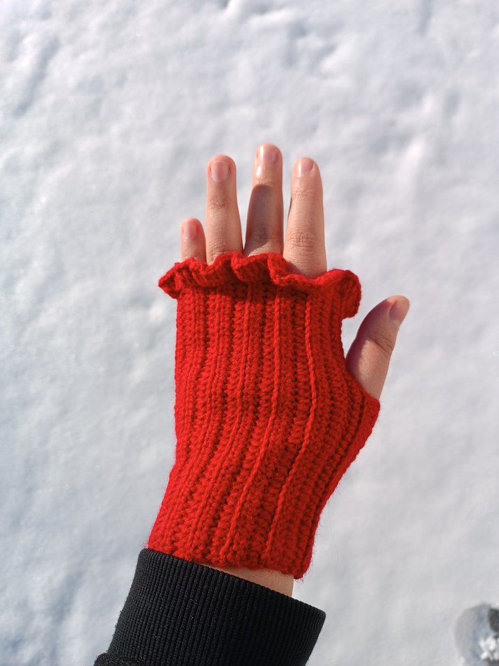 Kırmızı el örgüsü, fırfırlı ve parmakları açık kadın eldiveni. Sipariş üzerine örülür istediğiniz renkte hazırlanır. 2 gün karga süresi var. ışıktan renk tonu farklılıkları olabilir