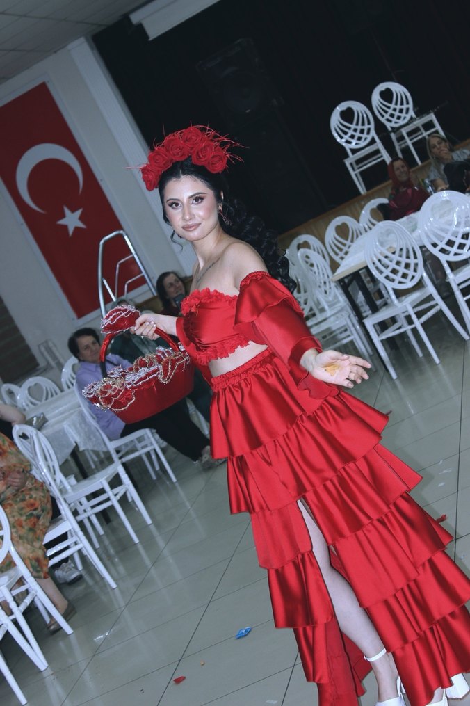 Kırmızı, straplez yakalı ve askılı kollu uzun, vücuda oturan etnik desenli fırfırlı abiye elbise. Renkli ve avant-garde pop kültür stilini yansıtıyor.