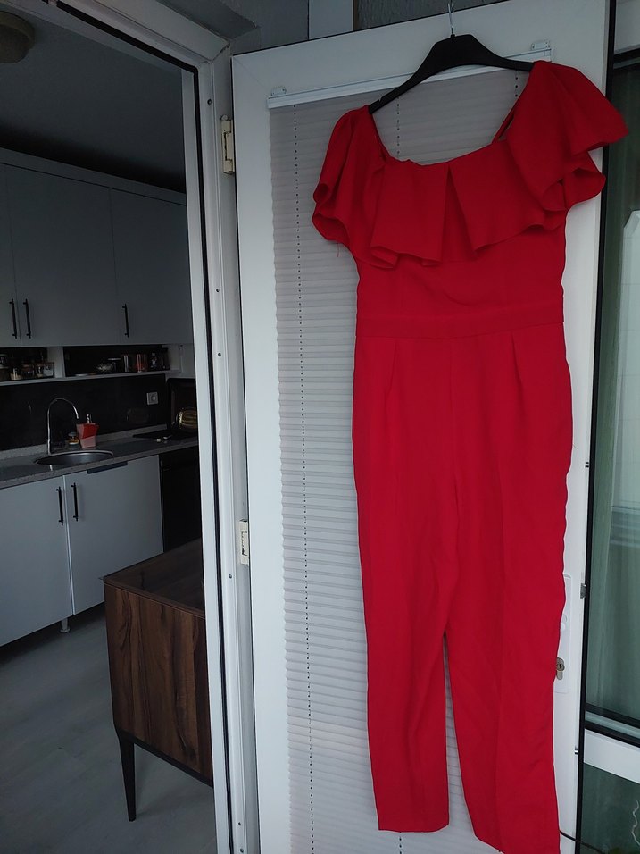 Kırmızı, straplez yakalı ve fırfırlı detaylara sahip, vücuda oturan midi boy tulum. Parlak yüzeyi ve kolsuz yapısıyla romantik akşamlar için uygun şık bir tasarım. yakasında bir sökük var dolapta dikicem fotoğrafta mevcut bakın iade yoktur marka temsilidir Kendi markası [ Ayhan markasıdır