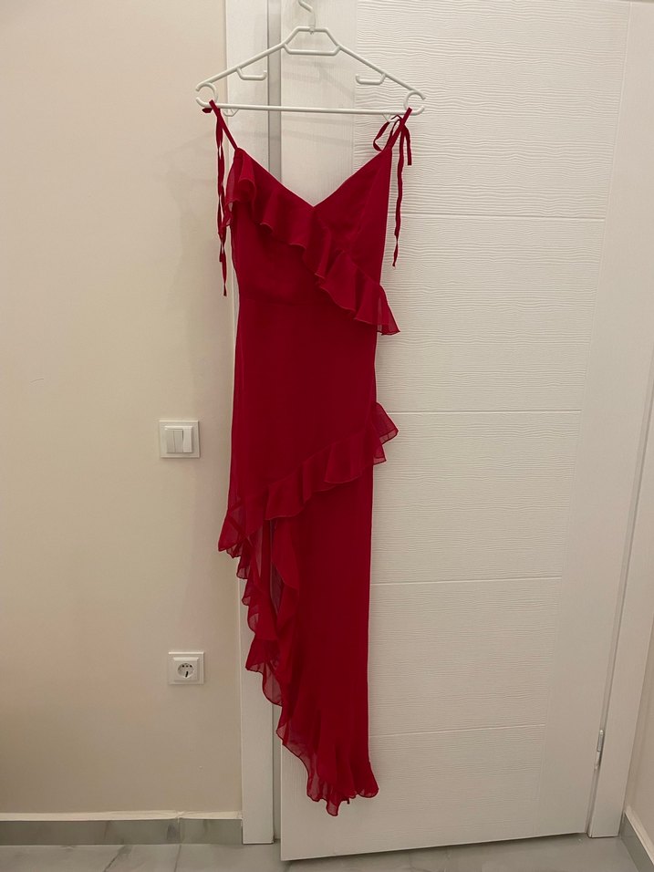 Koyu kırmızı renkte, sentetik kumaştan, V yakalı ve askılı, fırfır detaylı, vücuda oturan uzun elbisedir. Romantik buluşmalar için uygundur.