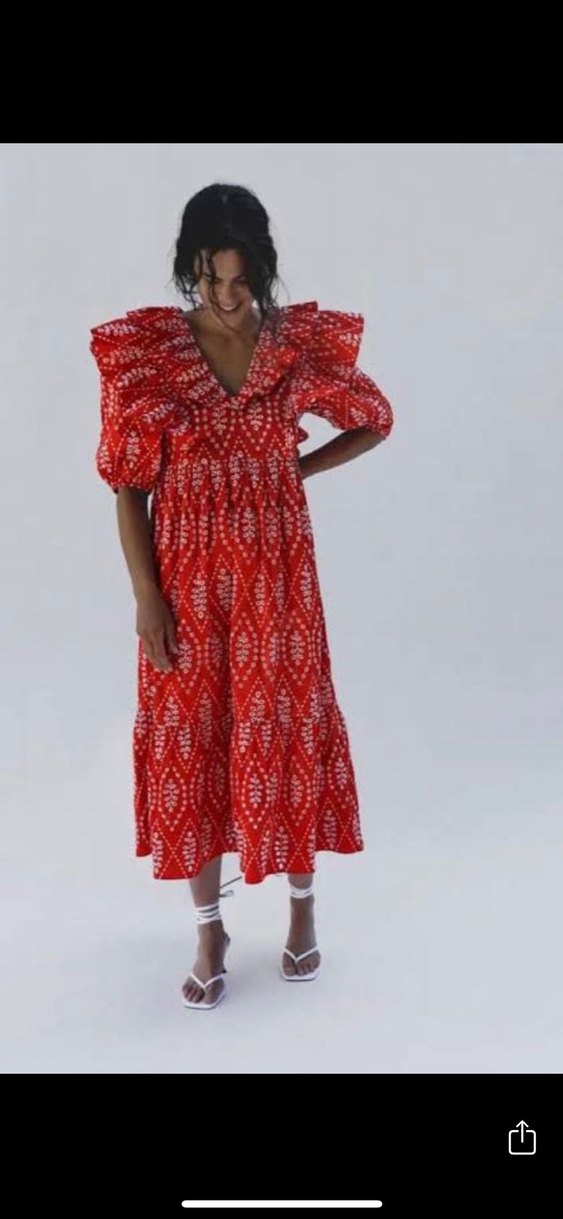 Renkli kırmızı uzun elbise, bol kesim, fırfır detaylı ve V yaka. Askılı kolları ve batik deseniyle bohem, retro tarzda.