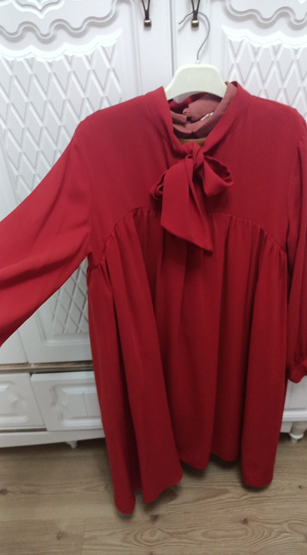 Kırmızı renkli, ipeksi kumaştan, uzun kollu ve bol kesim kadın tunik. Yüksek yakalı ve fırfırlı detaylı, ofis için uygun bohem tarzda.