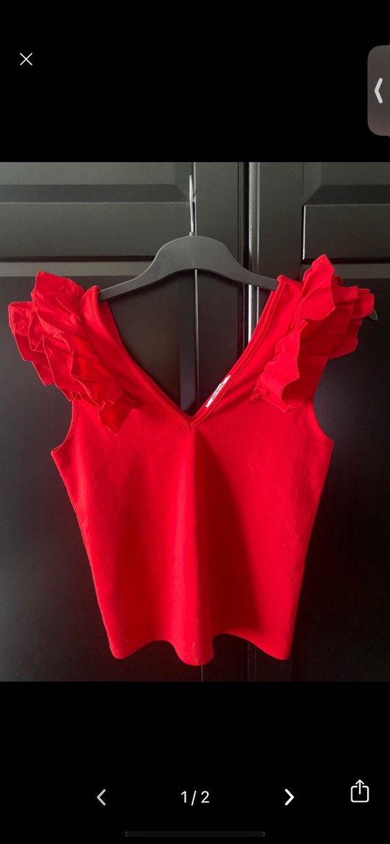 Kırmızı, v yaka ve omuzlarda fırfır detaylı, kısa ve fitted kesim bir bluz. Sentetik, romantik buluşmalar ve Paris sokak tarzı için uygun.