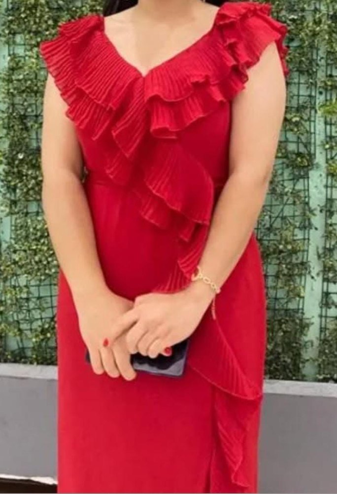 Parlak kırmızı sentetik kumaştan, v yaka ve fırfırlı detaylara sahip, kolsuz ve dar kesim uzun elbise. Düğün ve gösterişli yırtmaçlı