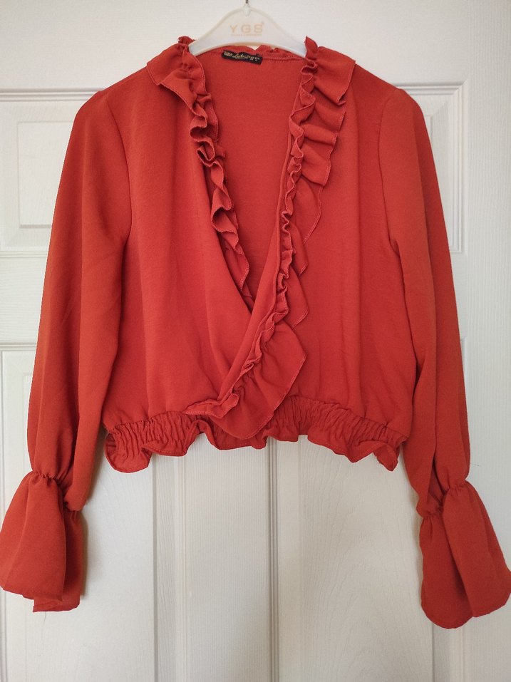 Kırmızı renkte, uzun kollu, fırfırlı V yaka ve bol kesim mini bluz. Parlak sentetik kumaştan, günlük sokak modasına uygun.