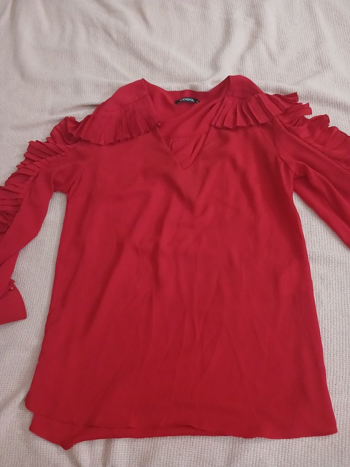 Kırmızı Fırfırlı V Yakalı Uzun Kollu Bluz