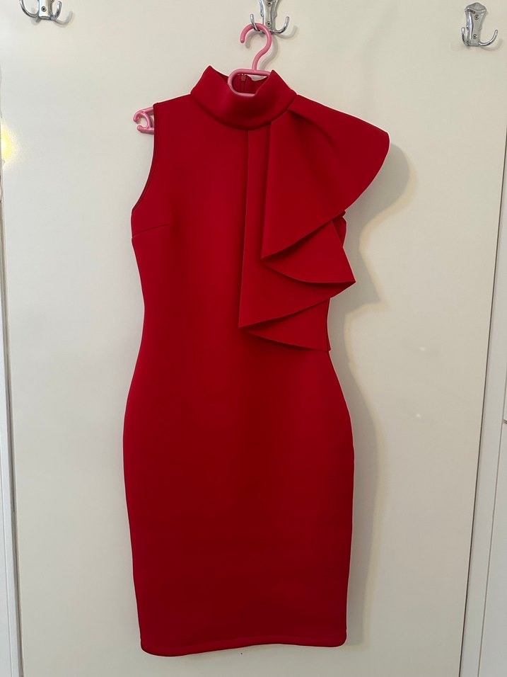 Kırmızı renkli, yüksek yakalı ve tek omuzda büyük fırfır detayı olan, vücuda oturan midi boy kolsuz elbise. Modern ve gösterişli. Çok az kullanıldı, hiç kusuru yok, dalgıç kumaşı var, 38 ve 40 beden için uygun.