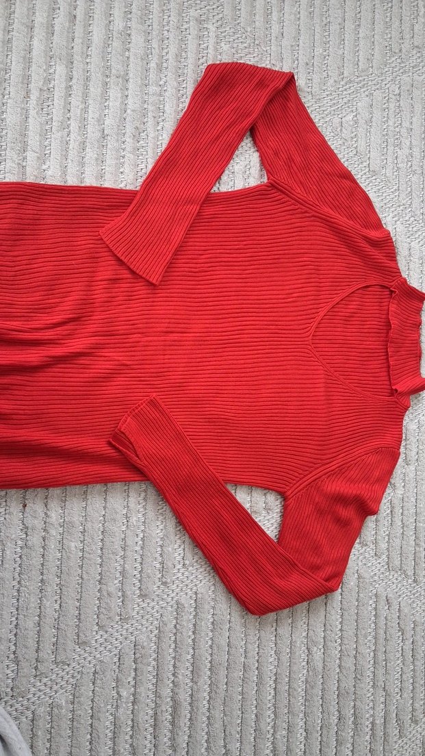 Kırmızı renkli, fit kesimli, uzun kollu ve boğazlı örme kadın kazak. Normal midi boy ve desensiz, rahat günlük kullanım için uygundur.