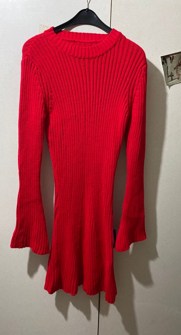 Kırmızı renkte, uzun kollu ve yüksek yakalı fitilli örgü midi elbise. Rahat ve cesur sokak stili için uygun, günlük kullanıma ideal. Diz kapak hizasında 95 cm boyunda