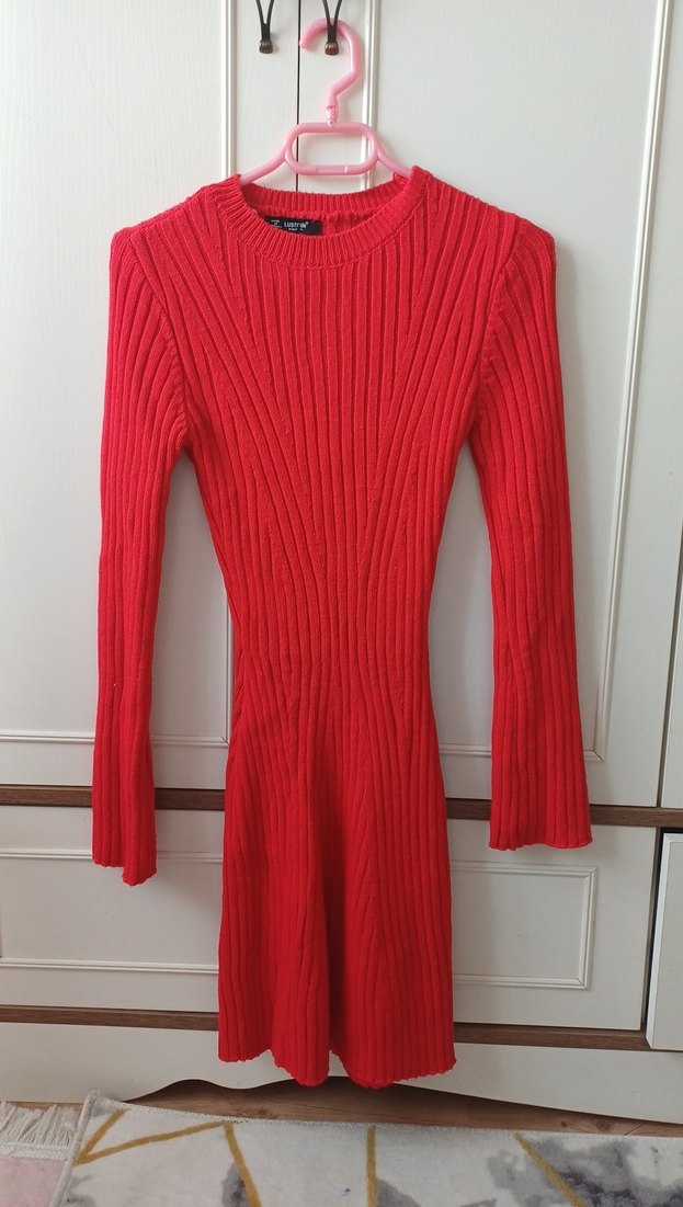 Uzun kollu, yuvarlak yakalı kırmızı fitilli triko midi elbise, rahat ve cesur sokak stili sunar. Günlük kullanıma uygun, desen içermeyen tasarımıyla dikkat çeker.