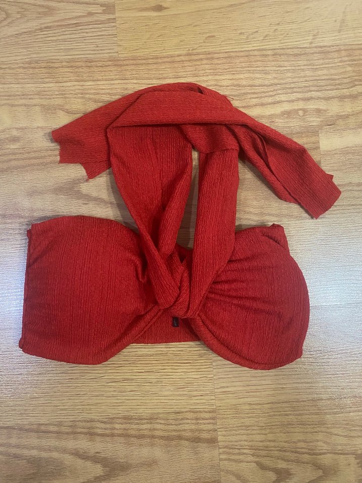 Kırmızı, fiyonk detaylı ve askılı, bohem tarzda günlük kullanıma uygun sıkı oturan bikini üstü.