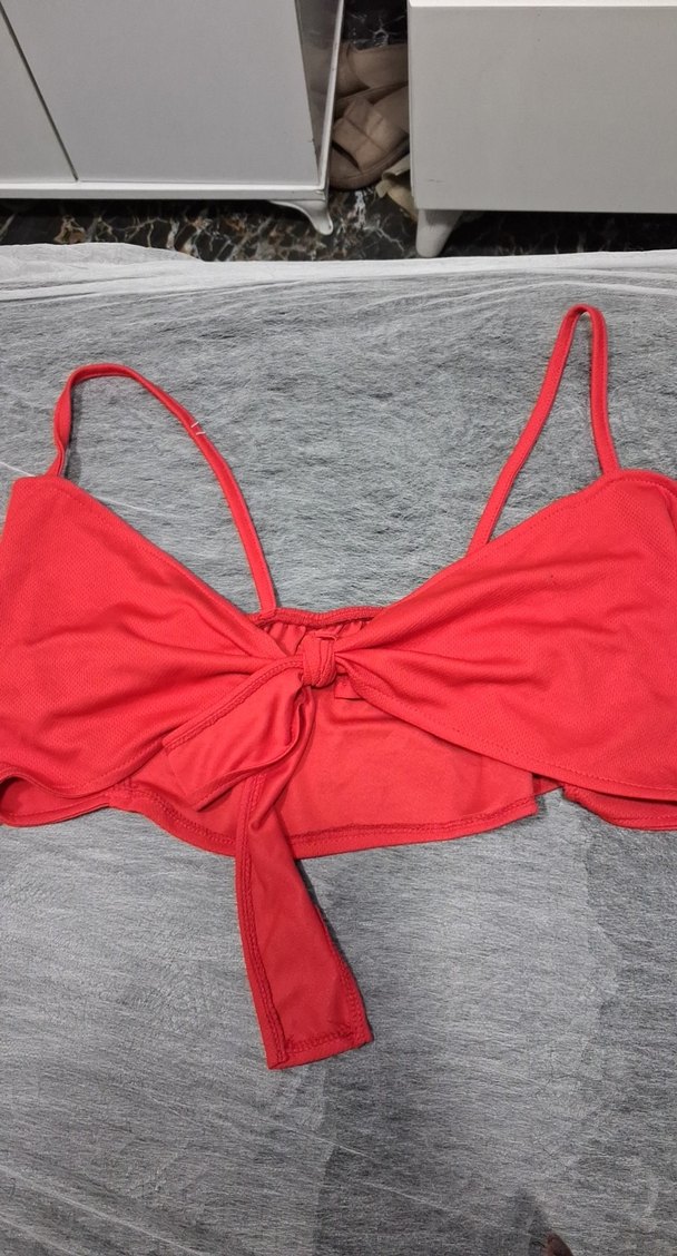 İnce askılı ve önünde fiyonk detayı bulunan kırmızı bikini üstü, fit kesimiyle cesur bir tarz sunar.