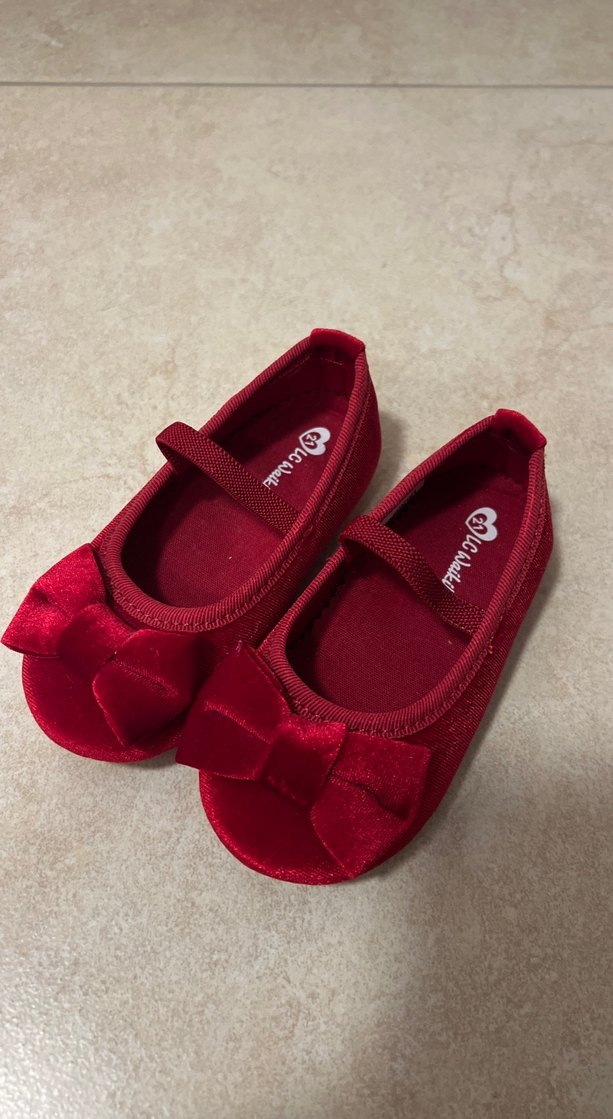 Kırmızı renkte, fiyonk detaylı kız çocuk babetleri. Süet malzemeden yapılmış, sade ve renklidir, desen içermez.