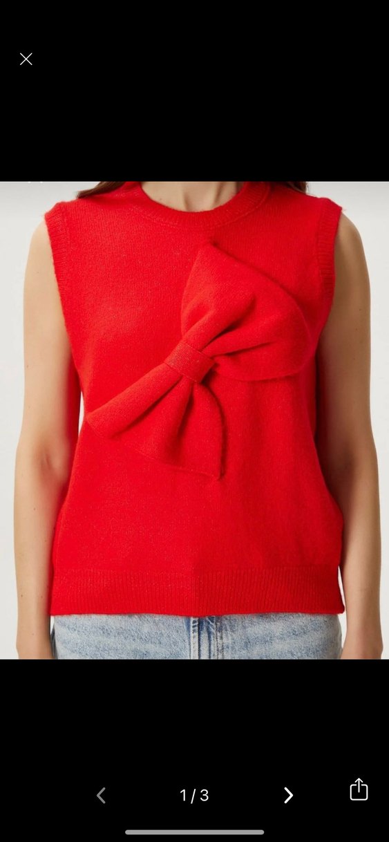 Parlak kırmızı renkte, kolsuz ve vücuda oturan triko süveter. Ön kısmında büyük fiyonk detayı bulunur, Hiç kullanılmadı. Ritnice marka