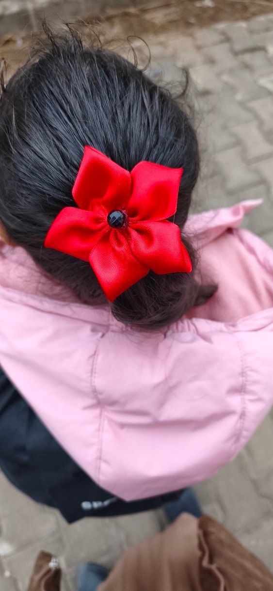 Sade ve renkli gotik tarza uygun, siyah boncuk detaylı, kırmızı sentetik kumaştan yapılmış minimalist fiyonk saç tokası.