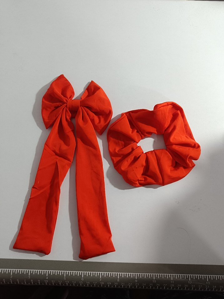Yumuşak ve sıcak kumaştan kırmızı fiyonk ve lastik toka seti. Minimalist sokak stili için uygun.