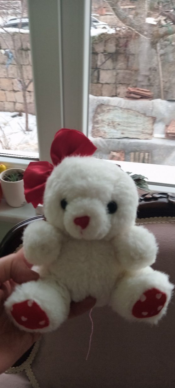 Yumuşak beyaz peluş ayıcık, kırmızı fiyonk ve patilerde renkli detaylarla. Sevimli ve sarılmalık oyuncak.