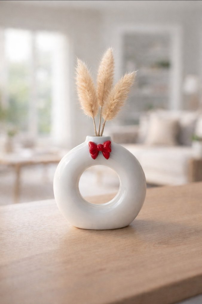 Yeni üeün gönderilir, Kırmızı fiyonk detaylı, dairesel tasarımlı beyaz seramik vazo. Kurutulmuş çiçekler için uygundur ve mekana pastel bir dokunuş katar.