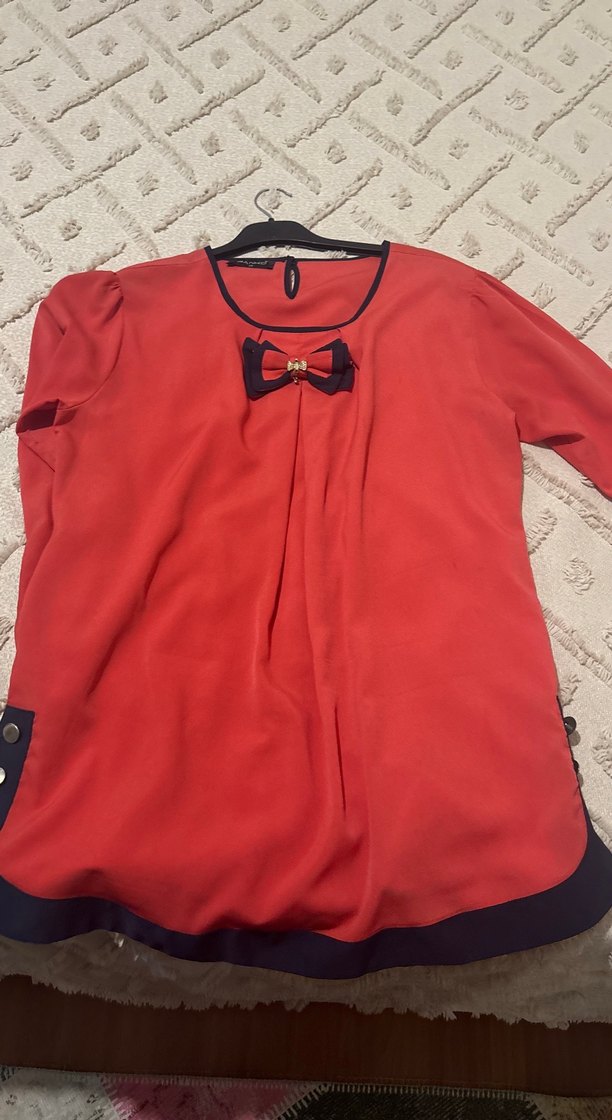Bol kesim, uzun kollu, yuvarlak yaka hamile bluzu, parlak kırmızı renkte ve fiyonk detaylı, ofis kullanımı için uygundur. ✨